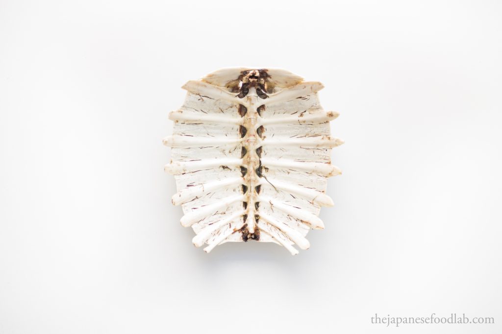 To remove the carapace, you’ll need to cut along the underneath of the carapace in long strokes to release the membrane attaching it to the body. This is similar to shucking scallops if you’ve done that before. Do not discard the carapace as it is used in soups.