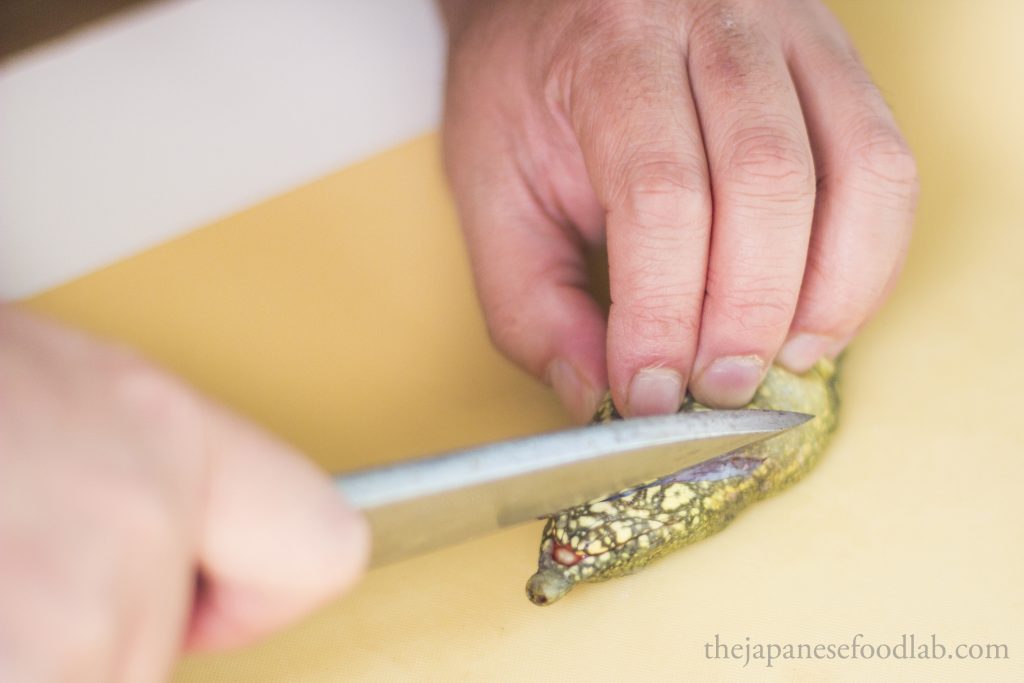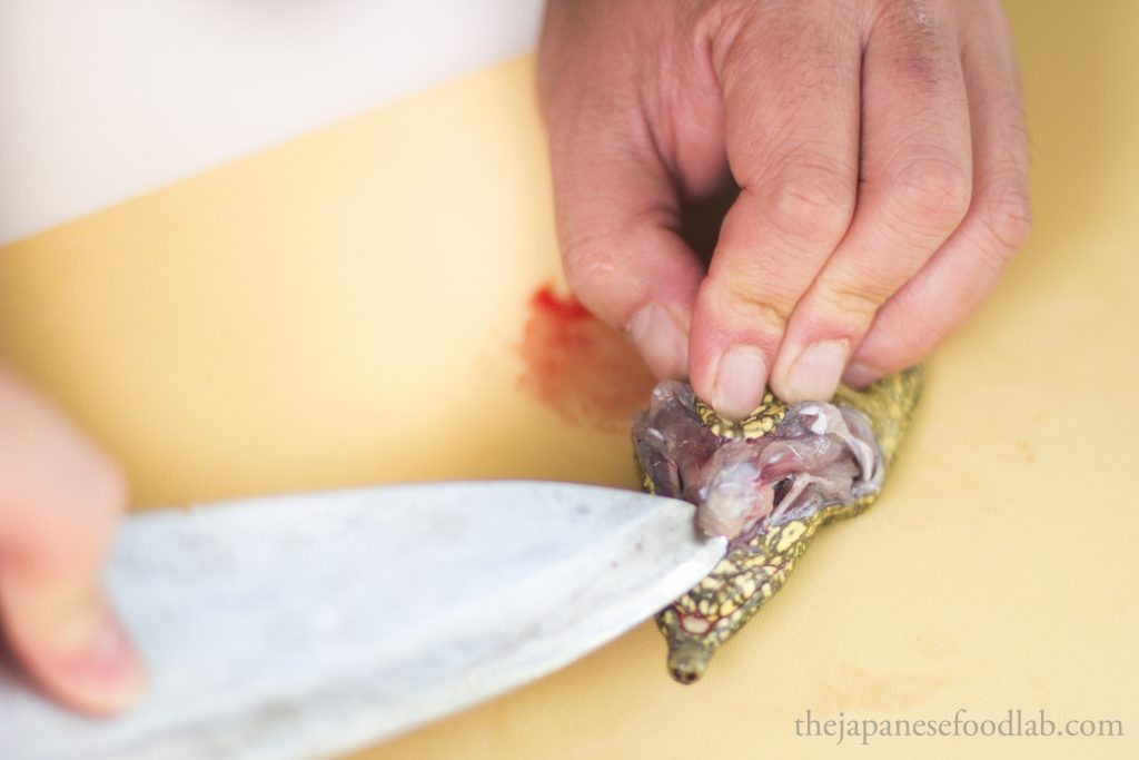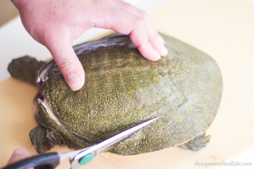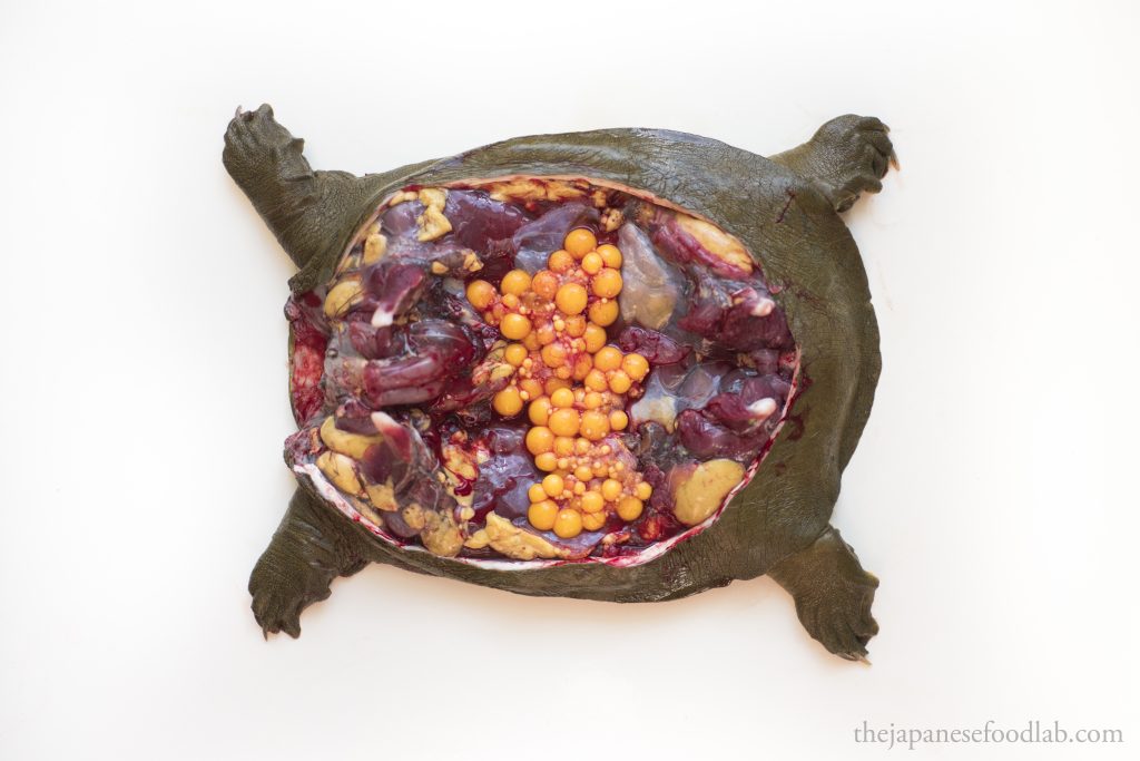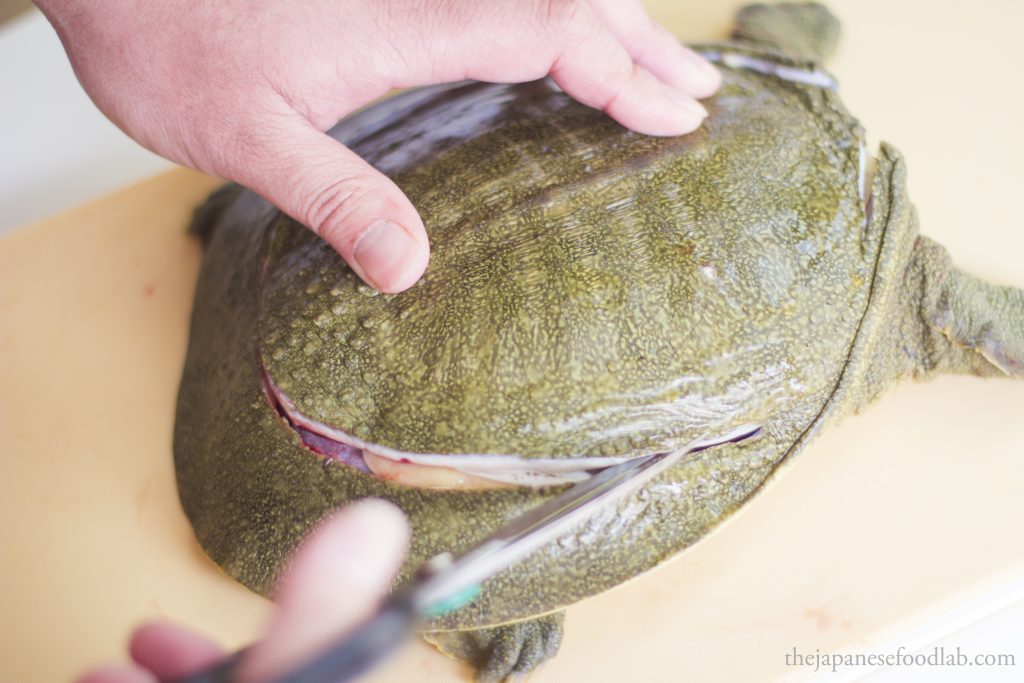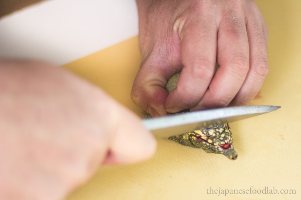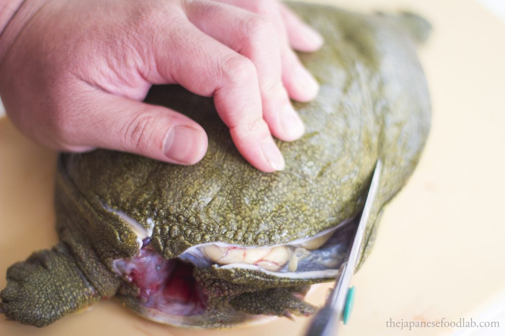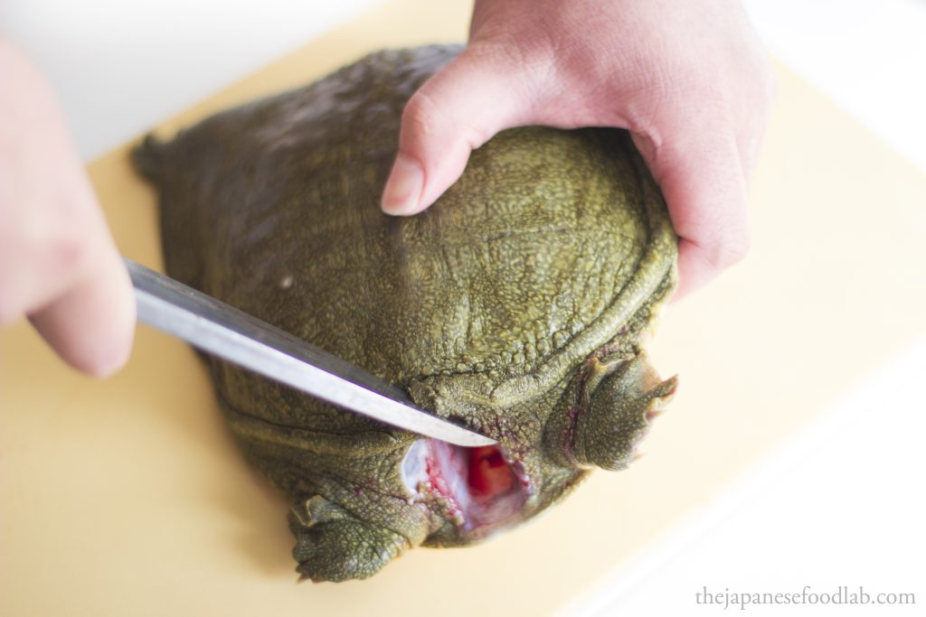 To quickly dispatch a suppon, you’ll want to grab its neck and make a quick incision to sever the spine to kill it, then only cut off the head in its entirety. This can either be done from the top or bottom of the neck depending on what you’re comfortable with. Most turtles and tortoises have the same instinctual response when flipped on their back, which is that they extend their heads to try to use it as a lever to flip themselves back up. In a restaurant, we take advantage of this by deliberately flipping the turtle on their back on a chopping board, causing them to extend their head so that we can grab it and dispatch them. I’ve seen one other chef do it another way, whereby they roll up a towel and let the turtle bite into the towel, before the chef pulls the towel to extend out its neck to dispatch it.