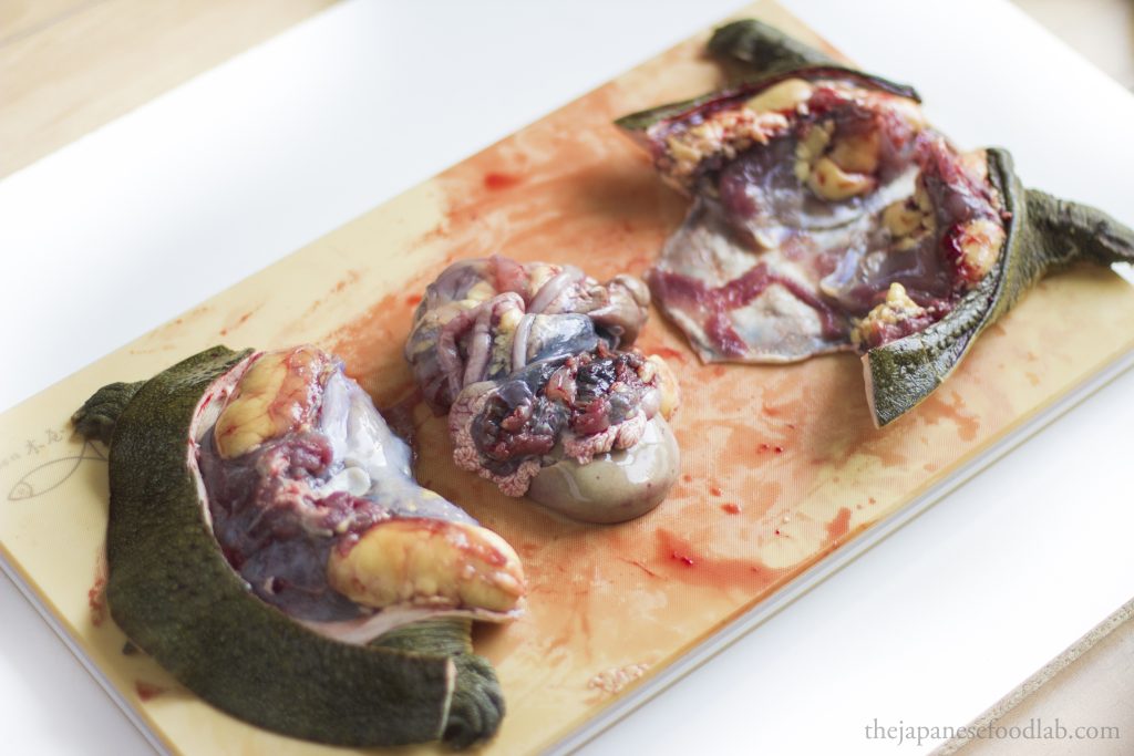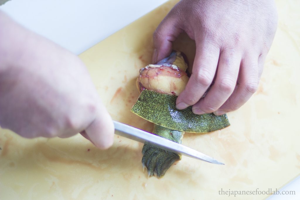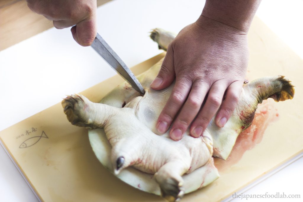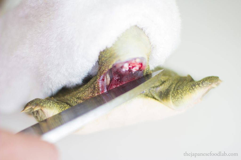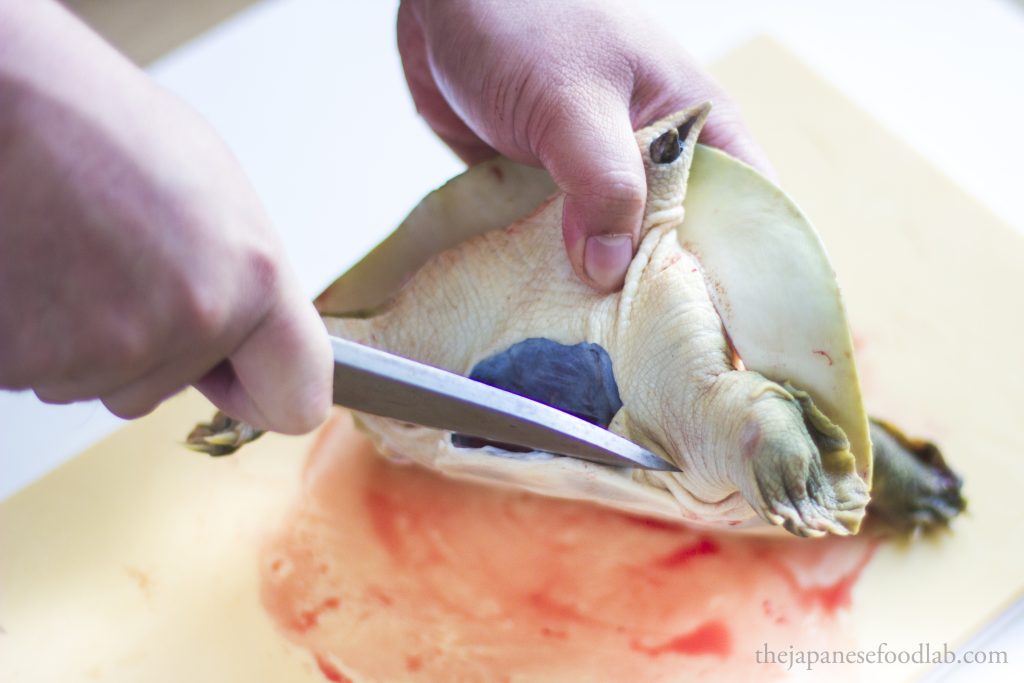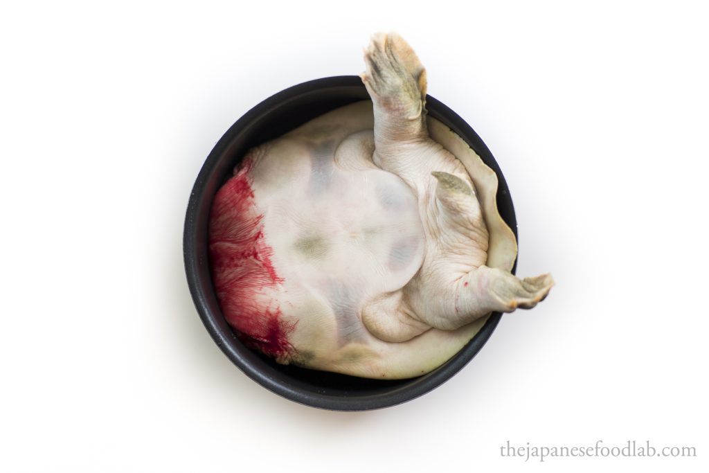 This leads us to our next part, which is that the entire process is quite bloody, even more so than filleting eels. Therefore, if you’re not comfortable with this, you’re better off either asking the fishmonger to fillet the turtles first, or see if you can buy them pre-cut from a high-end Japanese supermarket. The moment you cut off the head of the turtle, for a few moments the heart will continue to pump and a lot of blood will immediately start gushing out. Here, you have two options. You either do this entire process over the sink so that you can tip all the blood down the drain or immediately hold the headless turtle up right so that the blood doesn’t go everywhere, and then carry it over to a bowl and tip out all the blood for other culinary uses. Either way, you must drain out the blood from the turtle before you can proceed with filleting it.