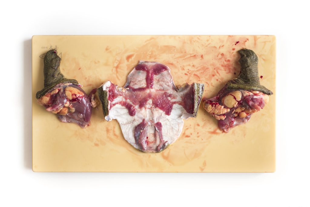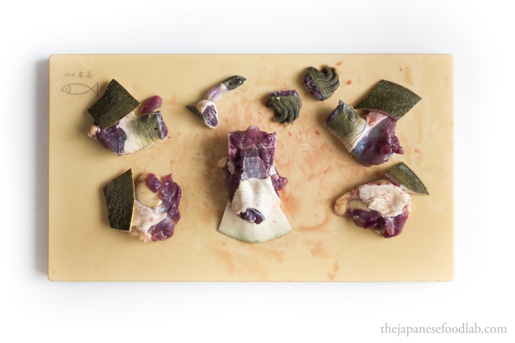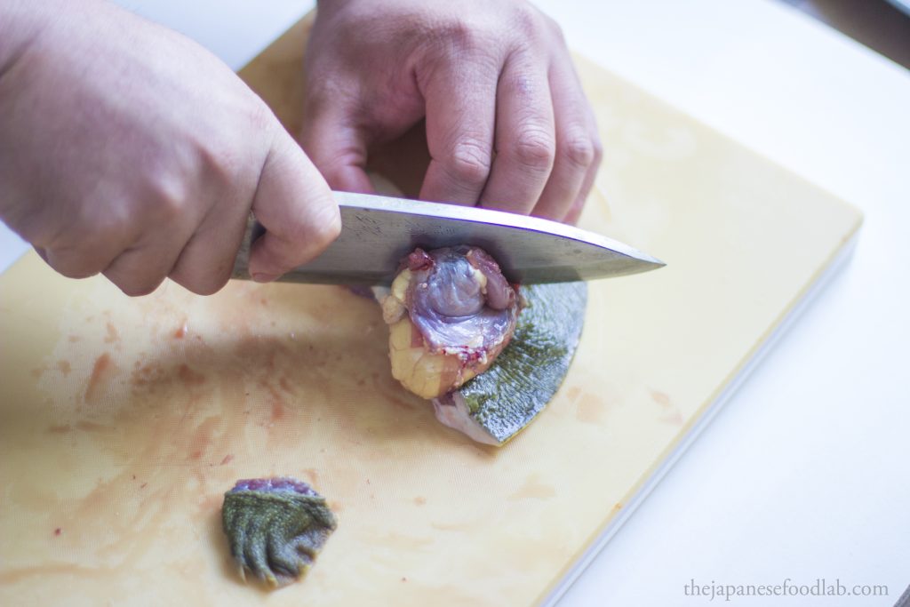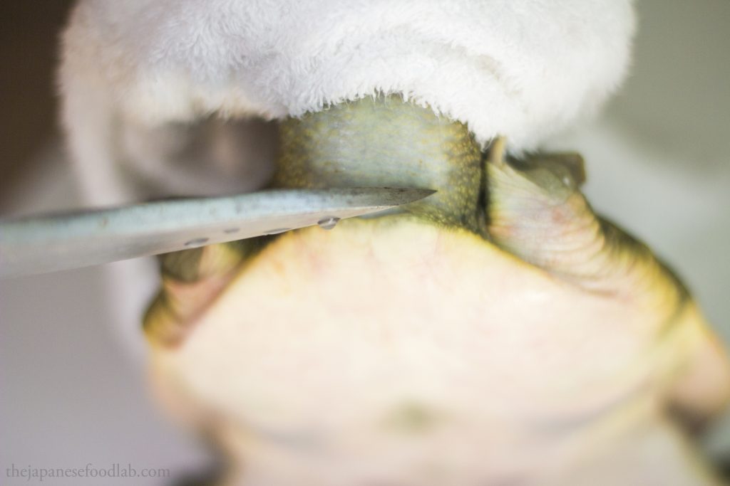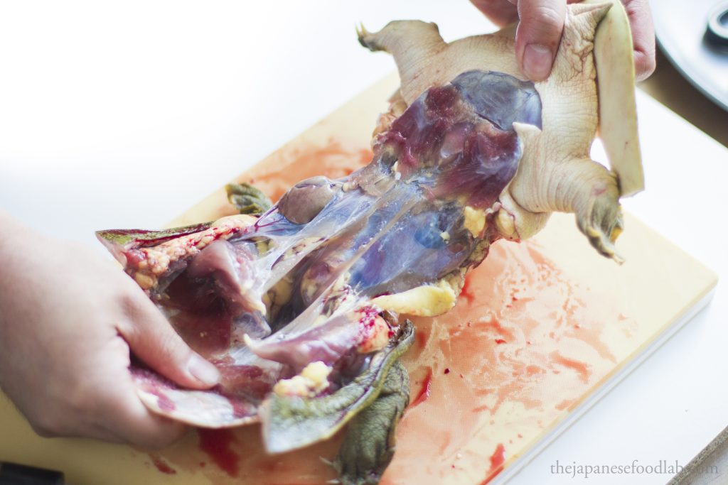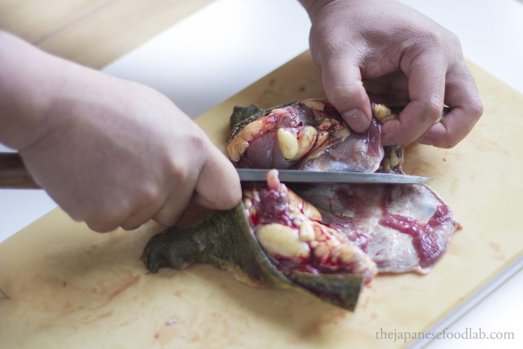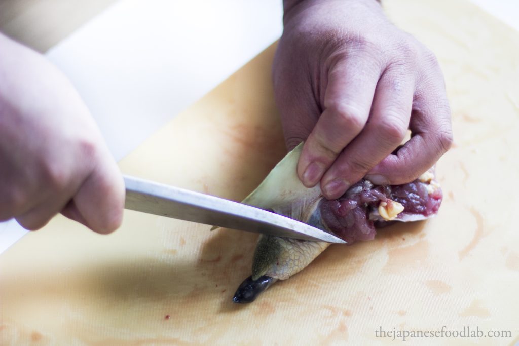 This leads us to our next part, which is that the entire process is quite bloody, even more so than filleting eels. Therefore, if you’re not comfortable with this, you’re better off either asking the fishmonger to fillet the turtles first, or see if you can buy them pre-cut from a high-end Japanese supermarket. The moment you cut off the head of the turtle, for a few moments the heart will continue to pump and a lot of blood will immediately start gushing out. Here, you have two options. You either do this entire process over the sink so that you can tip all the blood down the drain or immediately hold the headless turtle up right so that the blood doesn’t go everywhere, and then carry it over to a bowl and tip out all the blood for other culinary uses. Either way, you must drain out the blood from the turtle before you can proceed with filleting it.
