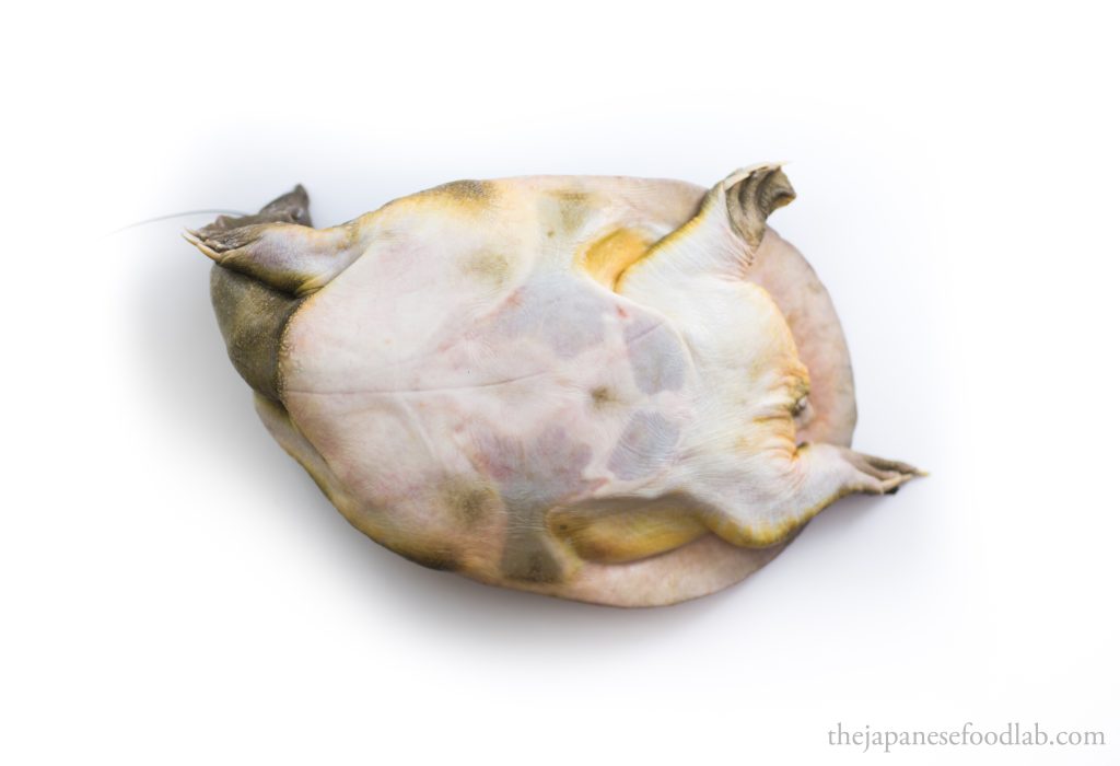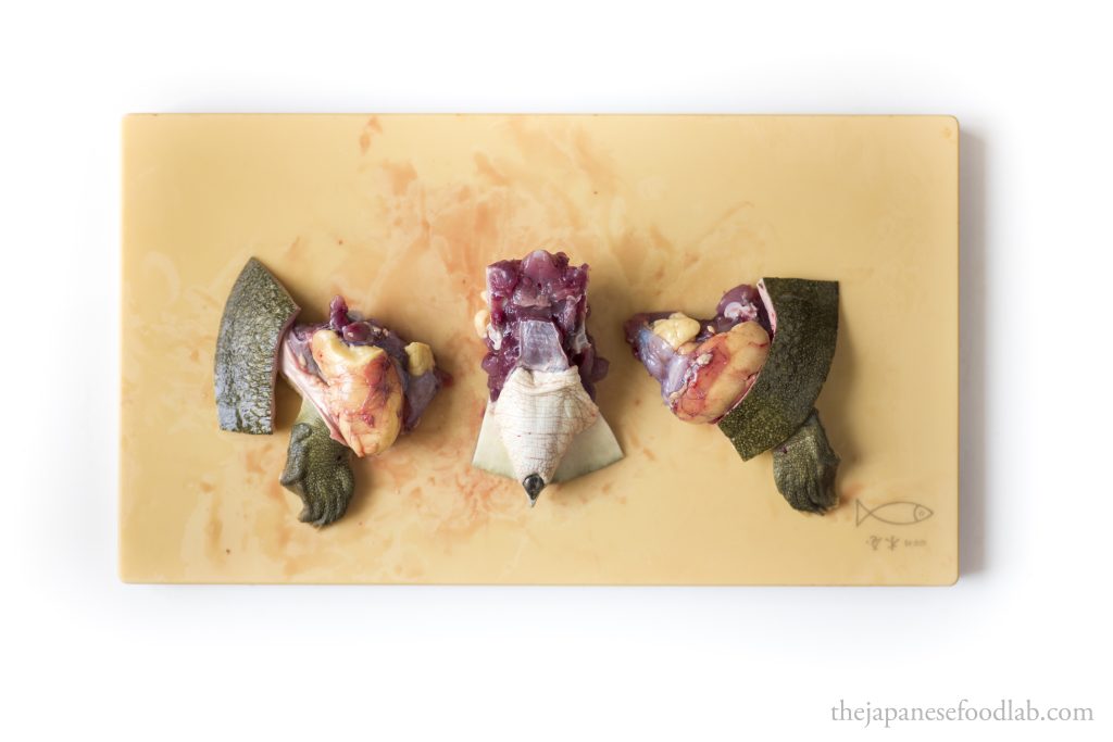 If you’ve followed along our site on how to prepare fish for making sushi, you’ll notice the majority of fish are filleted as three pieces, the two fillets and bones. This is known as sanmai oroshi (三枚おろし) and works well for at least 99% of fish you’d ever encounter. Today however, we’re learning how to fillet Suppon (すっぽん), or Japanese soft shelled turtle, which of course is not a fish, but a reptile with very different morphology. In Japanese, the method used to fillet turtle is known as yottsutoki (四つ解き), meaning to separate into four pieces as after dispatching, the turtle is quartered into its four limbs.