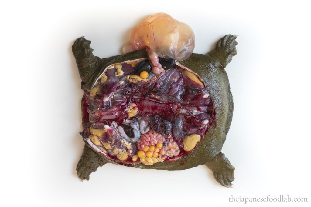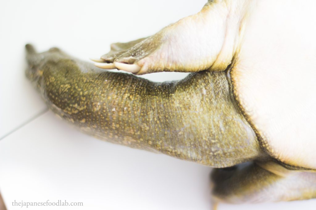 Probably the most defining feature of a suppon is that its shell is not keratinised like most turtles and tortoises, meaning that instead of a hard shell, it has a soft malleable shell that can easily be cut with a knife. While the centre of the shell still contains bones, the surrounding edges of the shell are rich in collagen. Known as empera (エンペラ), it is what make extremely rich and lip smacking soups of which suppon is most famous for. When cut up, each limb of the suppon should still have a small piece of empera attached.