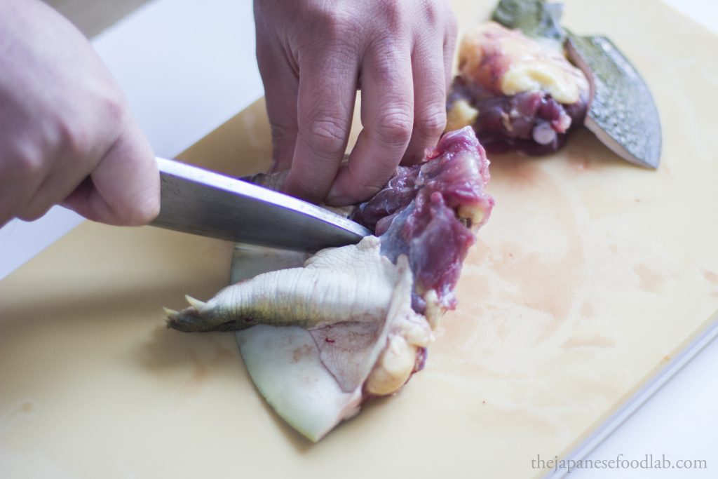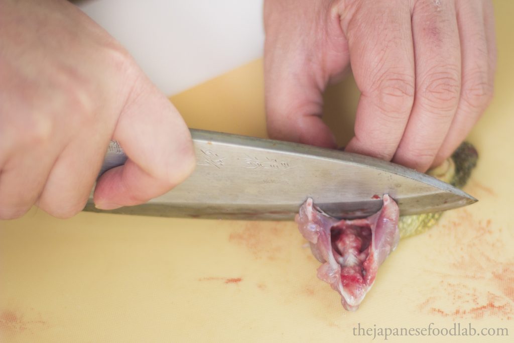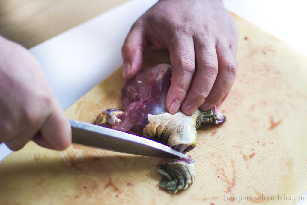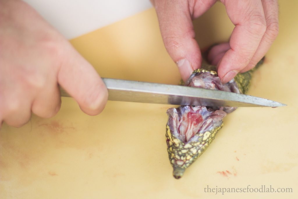 With the tail section, cut the tail short by 2 to 3 cm to remove the inedible urethra and discard. It will protrude when pressed with a knife.