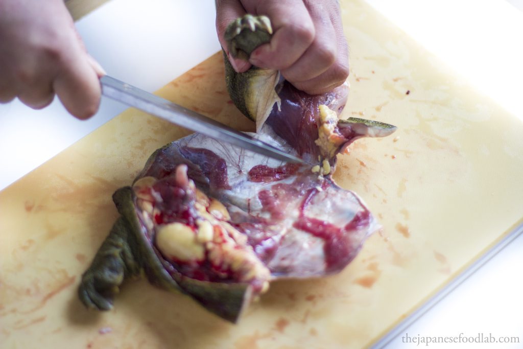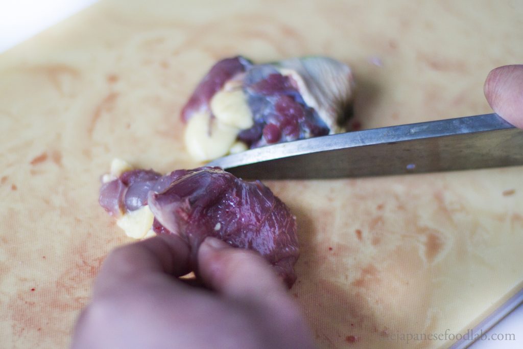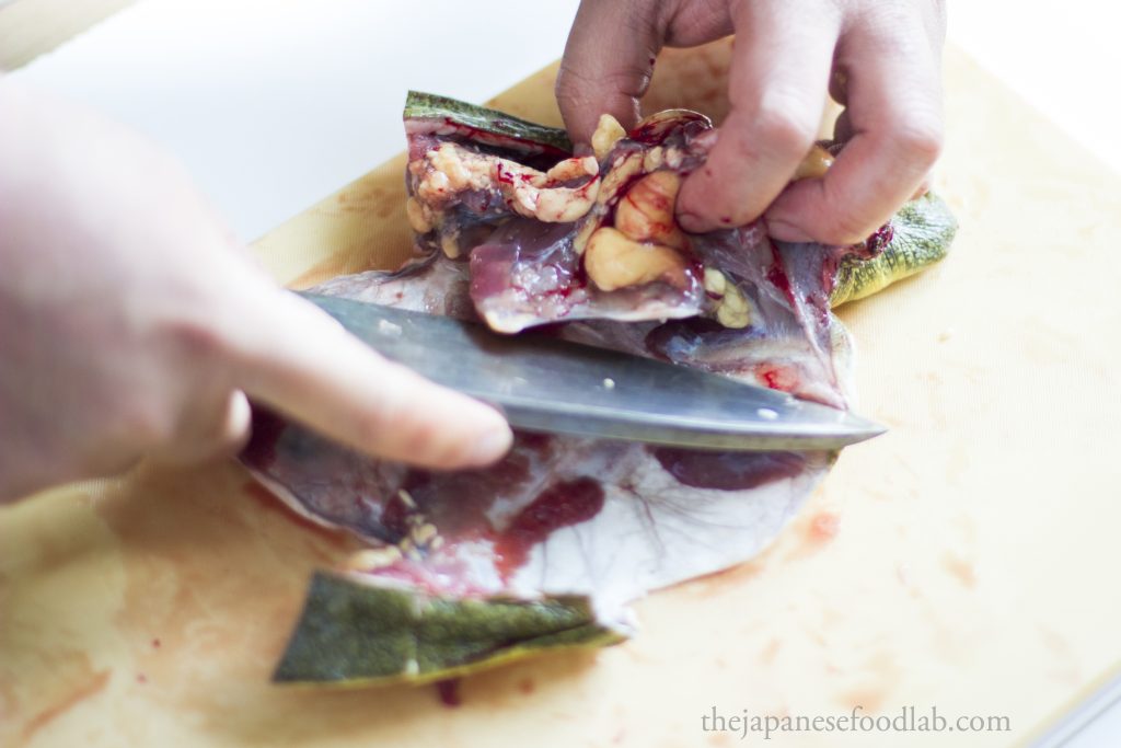 Attached to the liver you’ll see the dark green gallbladder which needs to be discarded. Underneath the liver you’ll find the heart, which if you’re quick enough will still be beating. The heart and liver are edible but not always served. Cut off the two testes if male or the unlaid eggs if female and gently rinse in water to extract any excess blood.