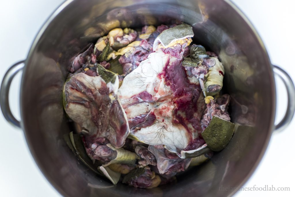 Now that you’ve blanched and removed the outer layer of skin from the different edible parts of the suppon, we’re ready to make the suppon stock. This stock serves as the base of any suppon dish and in our opinion is more delicious than the meat itself. It forms the base of any suppon nabe dishes, as well as more exotic nabe dishes like bear nabe.